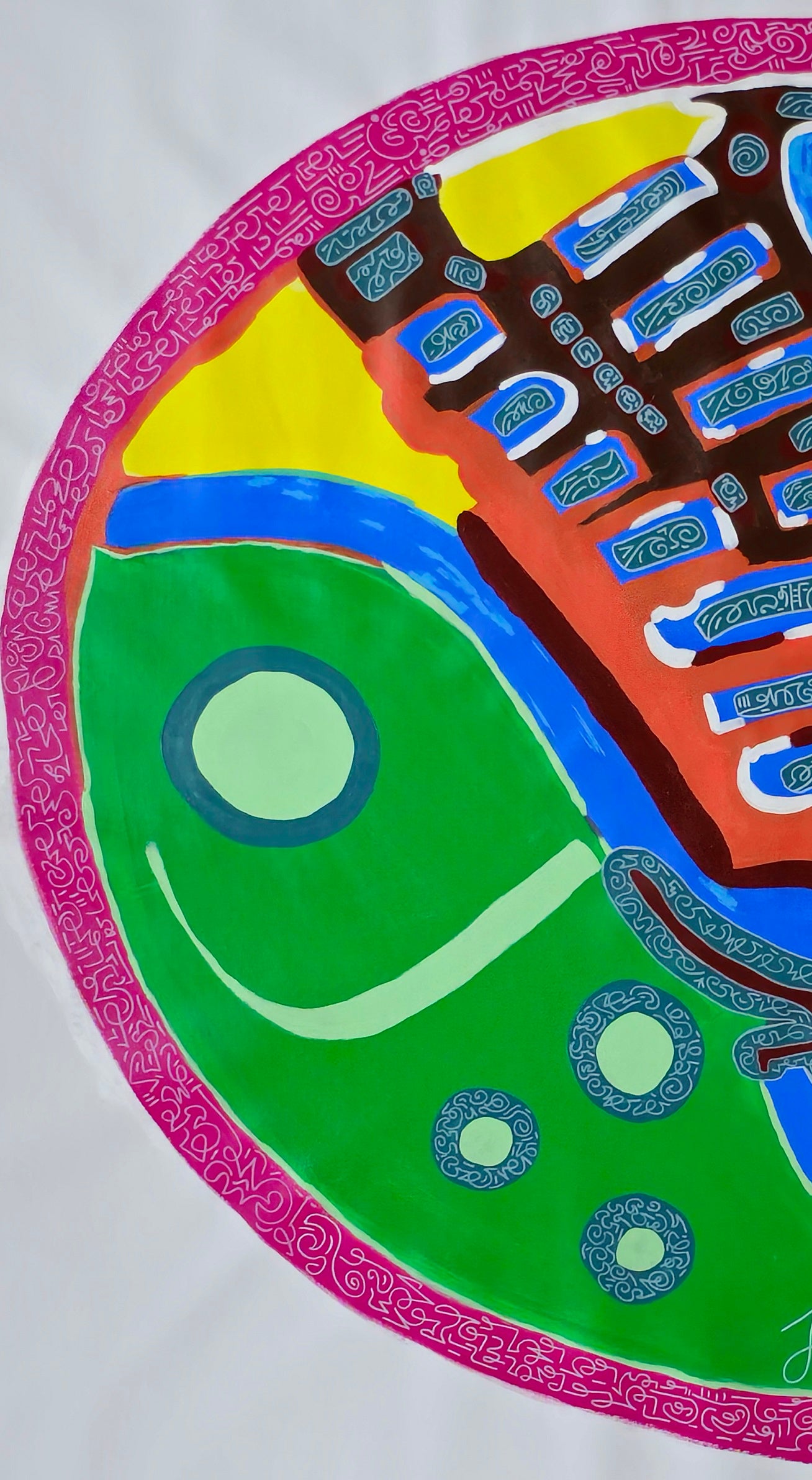 Guided by intuitive, meditative brushwork, Hortobagyi channels the dynamic energy of the Fire element through layered colour, movement, and light, igniting a sense of courage and renewal on the canvas. The composition’s vibrant flow mirrors the rhythm of life force—encouraging growth, confidence, and emotional warmth in the spaces it inhabits.