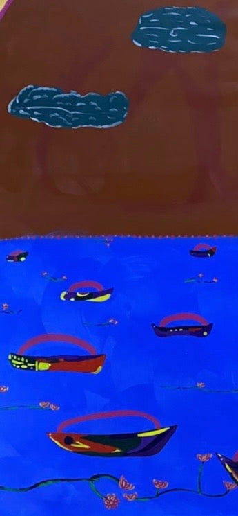 Heaven Lake is a luminous large-scale acrylic painting (158 cm x 135 cm, 2025) by London-based contemporary artist Linda Hortobagyi. This expansive composition portrays a vast, tranquil lake filled with colourful boats beneath a radiant golden sky, framed by a majestic mountain that symbolizes unity, aspiration, and the shared yet individual journeys we each undertake upon the lake of life.